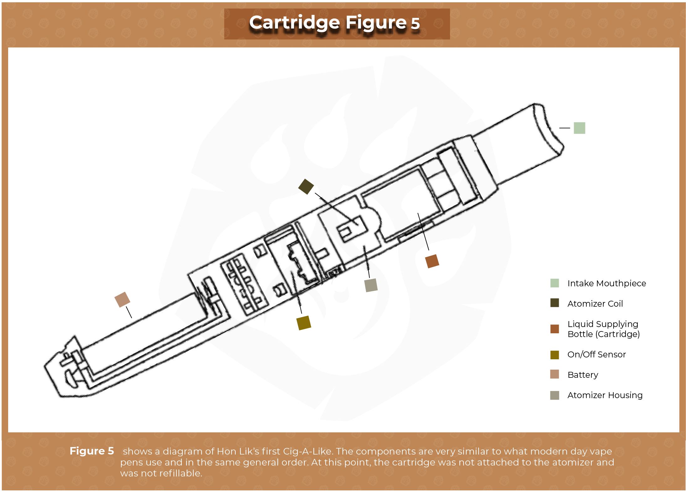 In 2003, Hon Lik, a Chinese pharmacist, created the modern e-cigarette after his father passed from lung cancer. His prototype had a mouthpiece/reservoir combination with a battery body attached. This "Cig-a-like" became the blueprint for modern vapes.