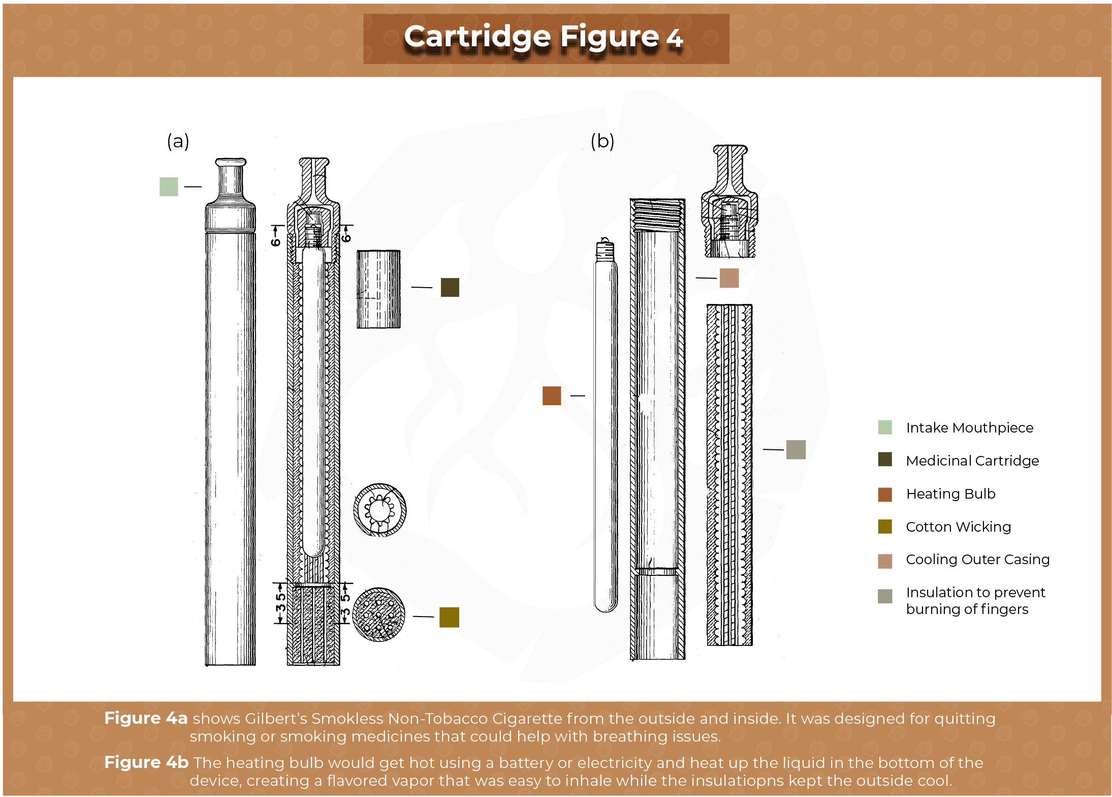 In the 1960s, Herbert A. Gilbert created the "Smokeless Non-Tobacco Cigarette" to help people stop smoking. In his patent, he referred to the holding tank as a "cartridge" - the first known use of the term in this context.