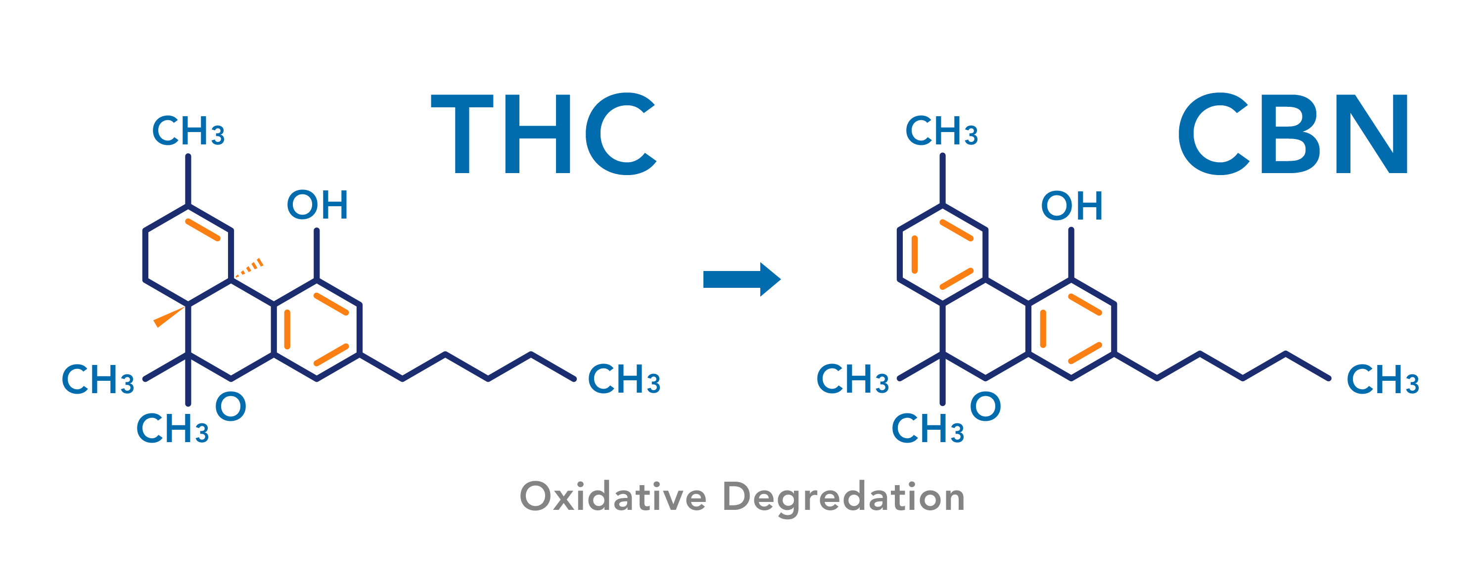 When oxygen reaches the THC or has prolonged exposure to it, it begins to break down into CBN (Cannabinol). CBN is less psychoactive than THC and is known for its sedative effects.