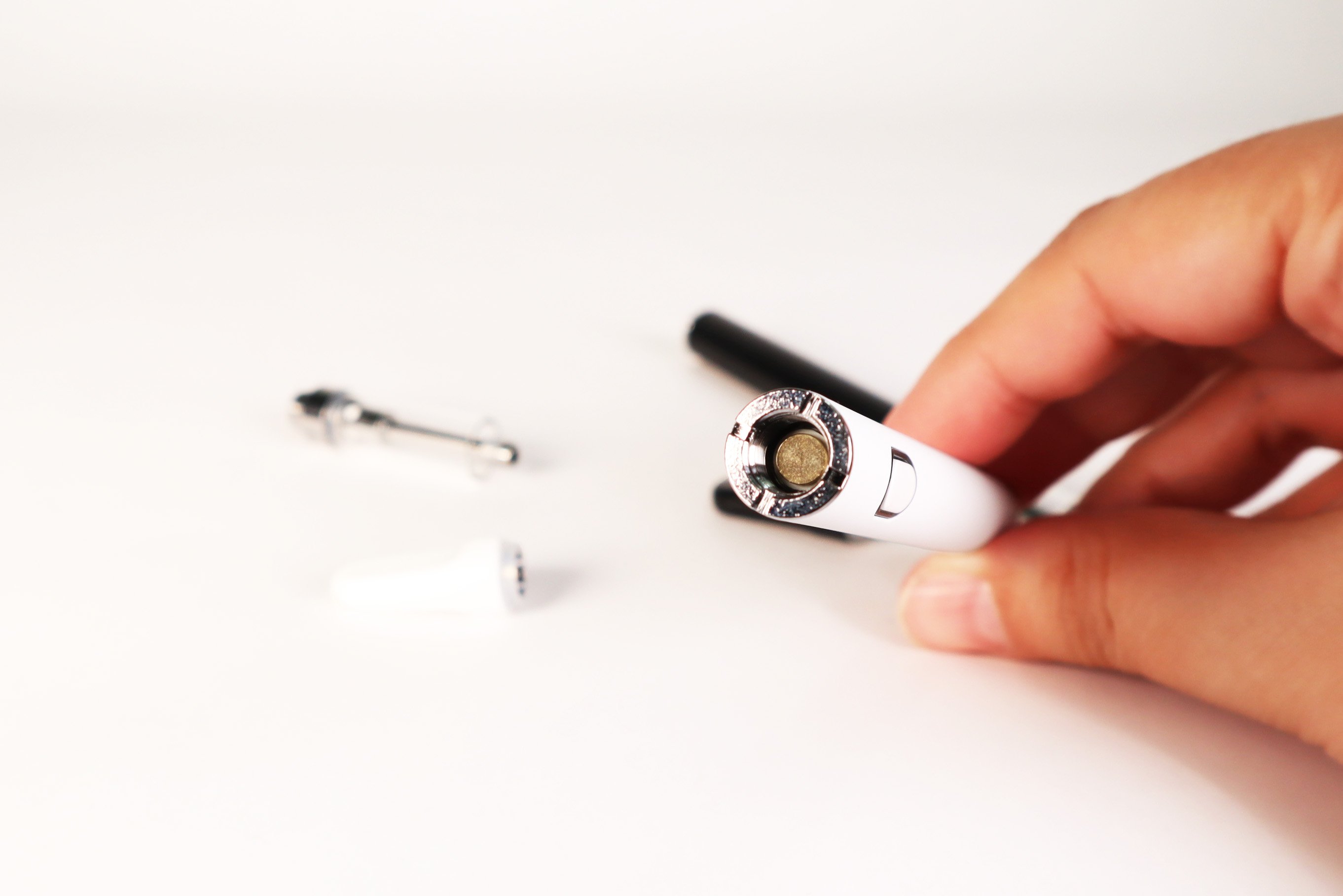 For both AIO cartridge options, take a small cotton swab soaked in isopropyl alcohol and wipe down both the bottom threading and contact portion of the AIO cart and the vape battery itself.
